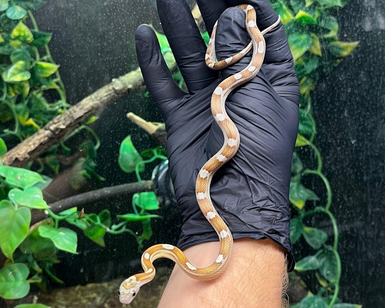 Corn snakes (Pantherophis guttatus) are popular and beloved reptile pets, known for their vibrant colours, docile nature, and manageable size. Native to the southeastern United States, these non-venomous constrictors have become a staple in the pet trade. Corn snakes display a striking pattern of bold colours, often featuring vibrant reds, oranges, and yellows against a background of earthy browns or greys. With an average length of 3 to 5 feet, they are considered a manageable size for many reptile enthusiasts. Corn snakes are relatively easy to care for in captivity, requiring a secure and appropriately sized enclosure with a temperature gradient, a hiding spot, and a substrate such as aspen shavings. They are primarily fed a diet of mice or rats, with the frequency depending on their age and size. Due to their calm demeanour and ease of handling, corn snakes are an excellent choice for both beginners and experienced reptile keepers alike.