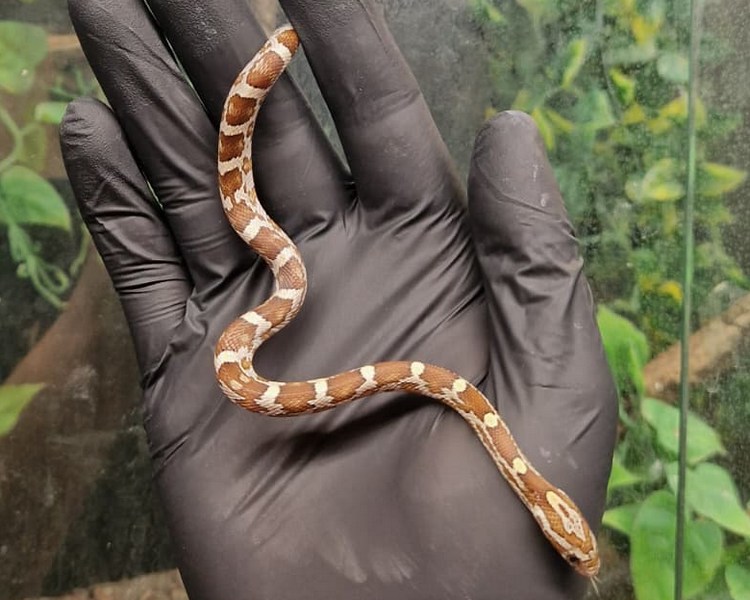 Corn snakes (Pantherophis guttatus) are popular and beloved reptile pets, known for their vibrant colours, docile nature, and manageable size. Native to the southeastern United States, these non-venomous constrictors have become a staple in the pet trade. Corn snakes display a striking pattern of bold colours, often featuring vibrant reds, oranges, and yellows against a background of earthy browns or greys. With an average length of 3 to 5 feet, they are considered a manageable size for many reptile enthusiasts. Corn snakes are relatively easy to care for in captivity, requiring a secure and appropriately sized enclosure with a temperature gradient, a hiding spot, and a substrate such as aspen shavings. They are primarily fed a diet of mice or rats, with the frequency depending on their age and size. Due to their calm demeanour and ease of handling, corn snakes are an excellent choice for both beginners and experienced reptile keepers alike.