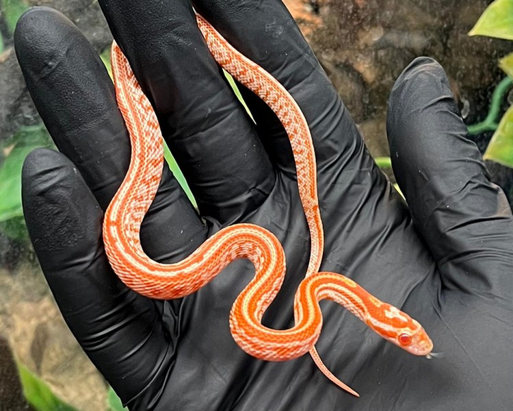 Corn snakes (Pantherophis guttatus) are popular and beloved reptile pets, known for their vibrant colours, docile nature, and manageable size. Native to the southeastern United States, these non-venomous constrictors have become a staple in the pet trade. Corn snakes display a striking pattern of bold colours, often featuring vibrant reds, oranges, and yellows against a background of earthy browns or greys. With an average length of 3 to 5 feet, they are considered a manageable size for many reptile enthusiasts. Corn snakes are relatively easy to care for in captivity, requiring a secure and appropriately sized enclosure with a temperature gradient, a hiding spot, and a substrate such as aspen shavings. They are primarily fed a diet of mice or rats, with the frequency depending on their age and size. Due to their calm demeanour and ease of handling, corn snakes are an excellent choice for both beginners and experienced reptile keepers alike.