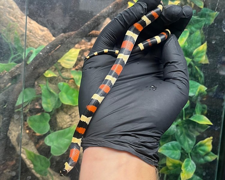 The Pueblan milk snake (Lampropeltis triangulum campbelli) is a colorful, non-venomous snake native to the arid, semi-arid regions of southern Mexico, especially Puebla, Morelos, and Oaxaca. It displays vibrant bands of red, black, and white or yellow, which mimic the appearance of venomous coral snakes—a form of Batesian mimicry that helps deter predators. Pueblan milk snakes are known for their docile temperament, making them popular pets among reptile enthusiasts.