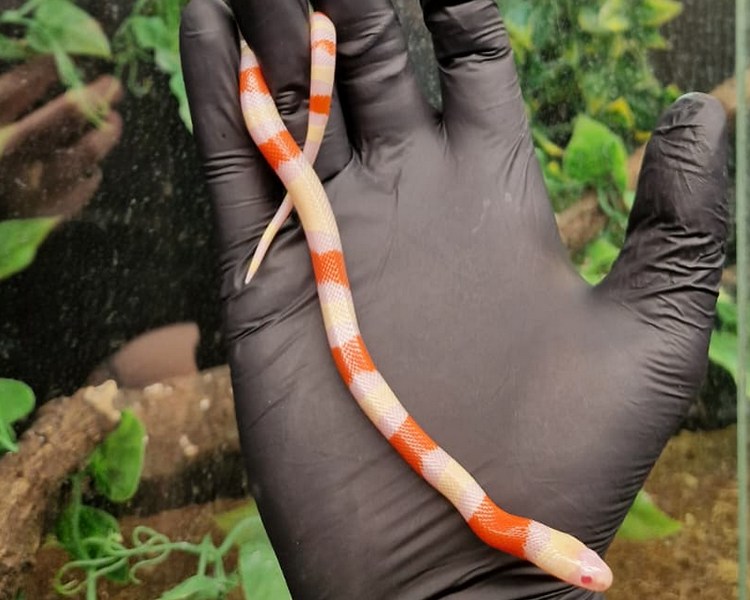 The Pueblan milk snake (Lampropeltis triangulum campbelli) is a colorful, non-venomous snake native to the arid, semi-arid regions of southern Mexico, especially Puebla, Morelos, and Oaxaca. It displays vibrant bands of red, black, and white or yellow, which mimic the appearance of venomous coral snakes—a form of Batesian mimicry that helps deter predators. Pueblan milk snakes are known for their docile temperament, making them popular pets among reptile enthusiasts.