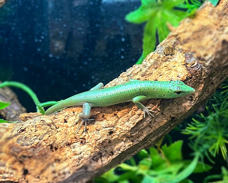 The emerald tree skink (Lamprolepis smaragdina) is a strikingly green, arboreal lizard native to Southeast Asia and the Pacific islands. Known for its vibrant emerald-green colouration, it may also display shades of blue or bronze, particularly on its underbelly or tail. Growing up to 30 cm in length, this skink is highly agile, spending most of its time in trees where it hunts for insects, small invertebrates, and occasionally fruits. It has a slender body and long limbs, well-suited for climbing. Emerald tree skinks are social, often seen in groups.
